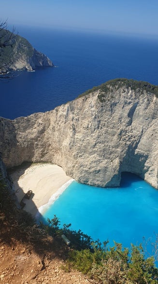 Shipwreck Beach (van bovenaf) Het meest bekende plekje van Zakynthos is natuurlijk wel Shipwreck beach Ik heb het strand zowel van bovenaf bezocht als op het strand zelf. Je kunt dit strand enkel met een bootje bezoeken. Ban bovenaf heb je een spectaculair uitzicht over de 180 meter steile en hoge klif. Dit is echter niet weggelegd voor de personen onder ons met hoogtevrees want het is enorm diep! Maar zeker de moeite waard en zorgt voor geweldige foto's!